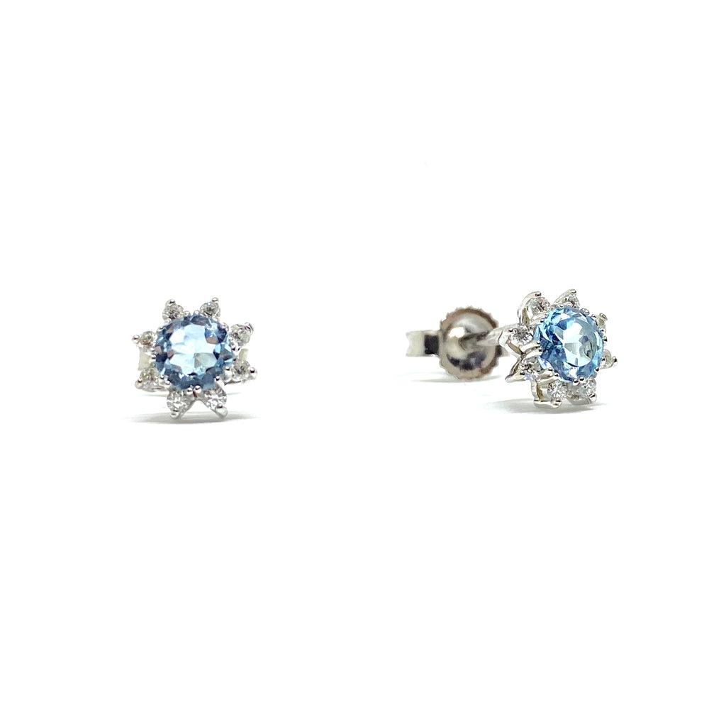 Featuring a beautiful 4mm blue topaz in the center, surrounded with 8 diamonds