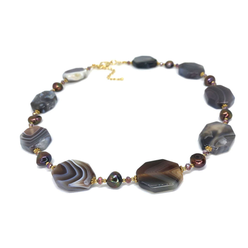 This magnificent necklace boasts beautiful grey and brown hues in richly veined Botswanan agate slices. These earthy tones are complemented by gold plated silver fittings and 8 rich chocolate coloured pearls, for an unusual necklace that’s bound to turn heads.