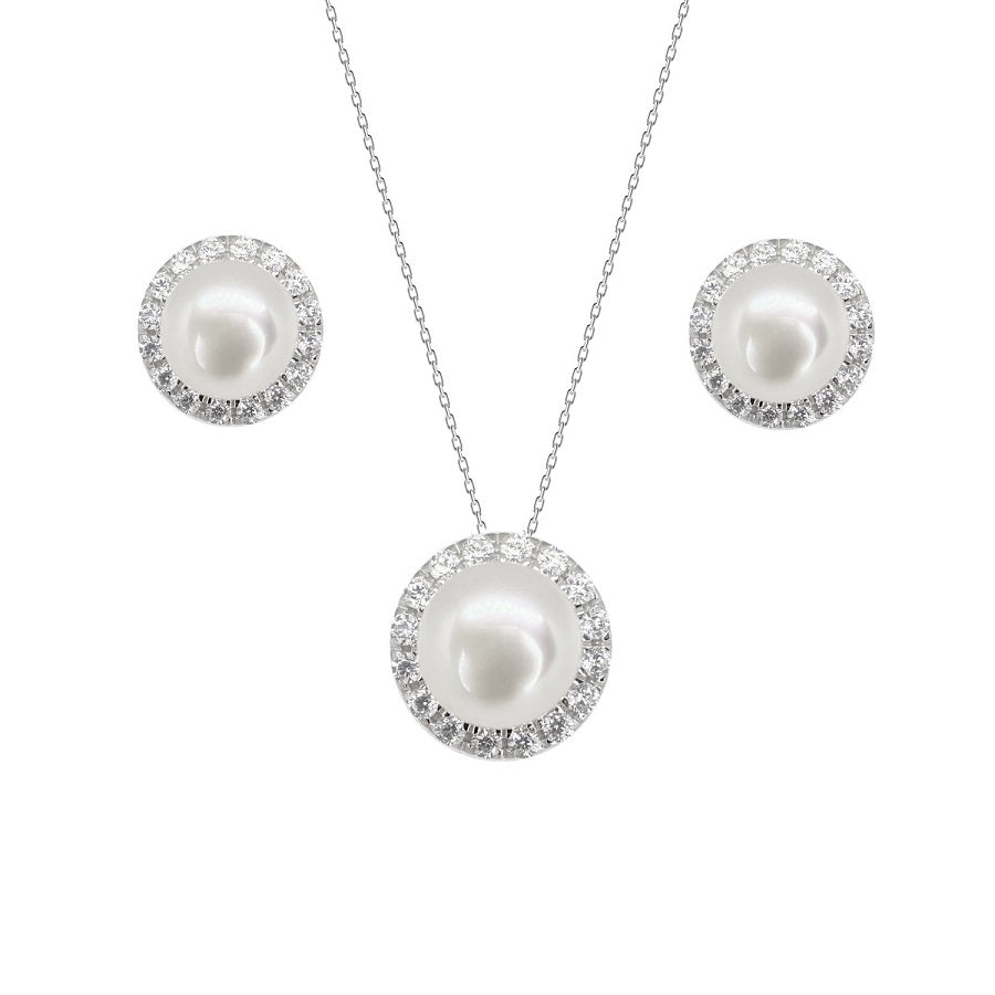 A beautiful round white 10mm freshwater cultured pearl stands proud from the pretty setting, surrounded by 16 cubic zirconium crystals to form a dazzling pendant with a contemporary twist. Matching silver earrings measure 9mm with comfortable butterfly backs.