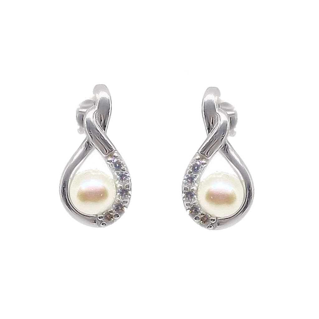 Add a touch of glamour to any outfit with this unique infinity style earrings made from 925 sterling silver earrings set with 5 sparkling cubic zirconia crystals, finished with a 5-6 mm round white freshwater cultured pearl.