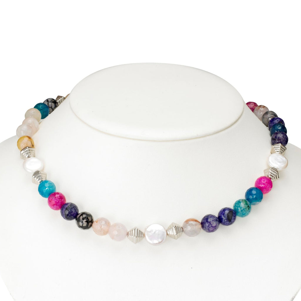 This opulent necklace of semi-precious agate in a pretty array of colours will set off any plain blouse or dress. Glistening shades of turquoise, pink, purple and blue are complemented by palest pink and grey with white coin pearls and corrugated beads. This fabulous 18" necklace is finished with a magnetic clasp, that makes it so easy to wear.