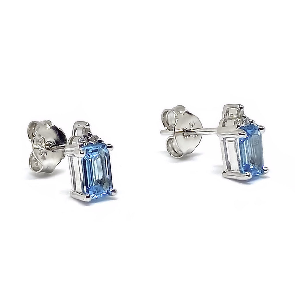 These earrings feature an emerald cut blue topaz measuring 5mm with 3 small diamonds at the top for extra sparkle.