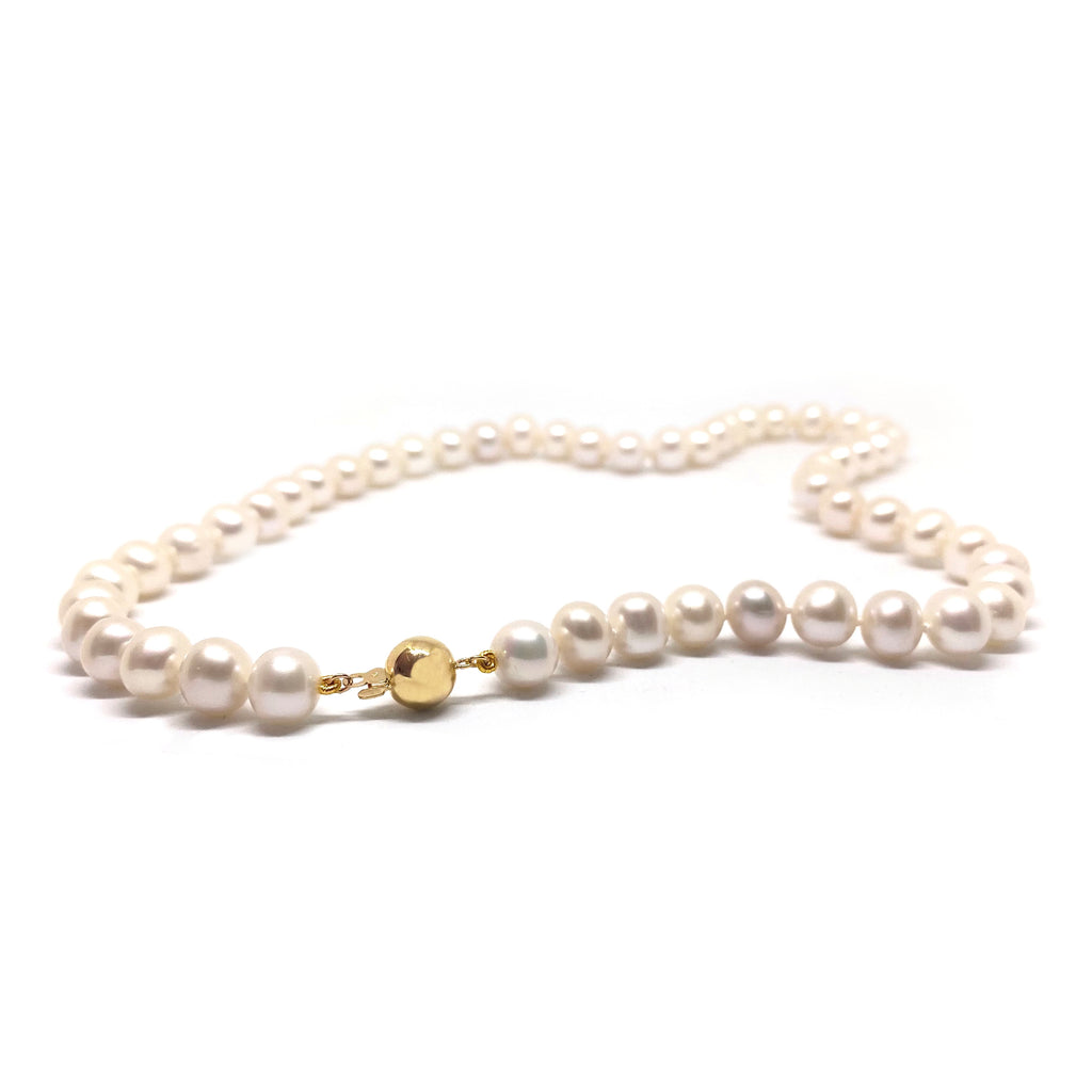 Each 7-8mm lustrous white pearl is carefully hand selected and threaded on knotted silk to create a stunning 17” necklace, discreetly finished with a beautiful secure round 9k gold (Stamped on clasp handle) ball clasp.