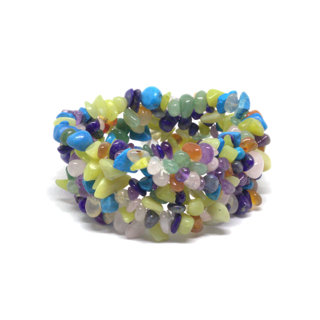 Each hand selected, polished chip varies in size and are neatly strung together to form five rows of Turquoise, Amethyst, Lapis Lazuli, Rose Quartz, Aventurine, Olive Jade and Carnelian. The perfect accessory to add the finishing touch to so many outfits.