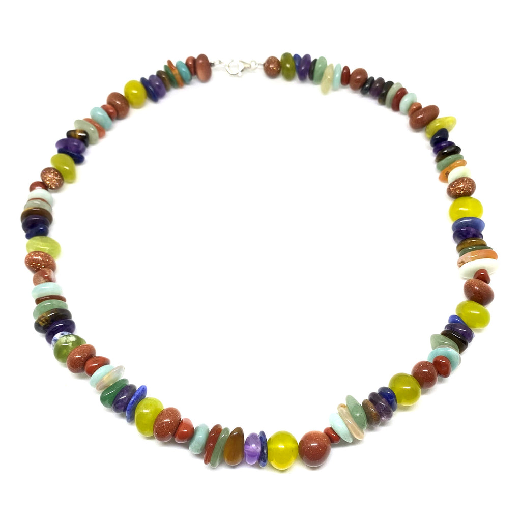 This unusual necklace boasts a rare mix of differently coloured semi precious gemstones, which together combine to create the perfect autumn necklace of greens and blues, with browns and russet.